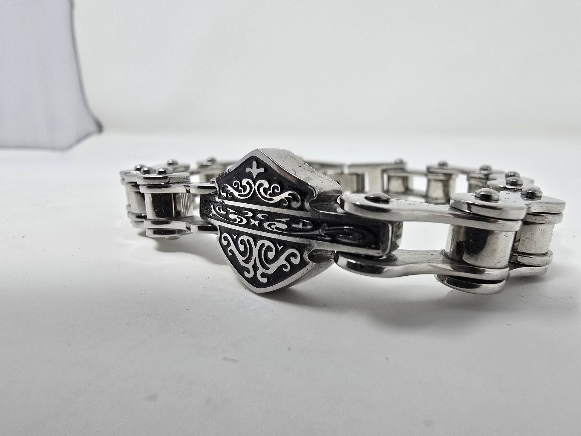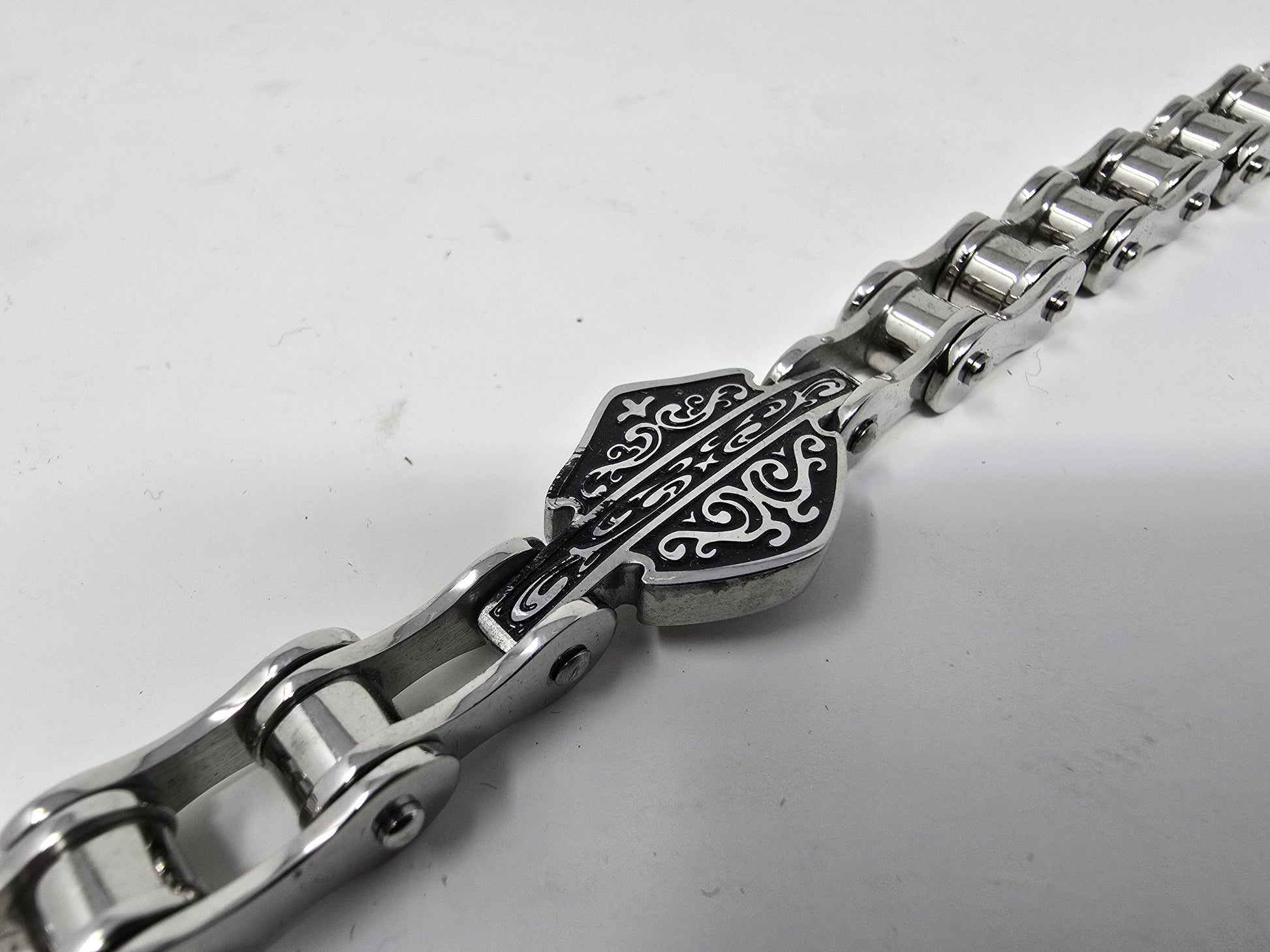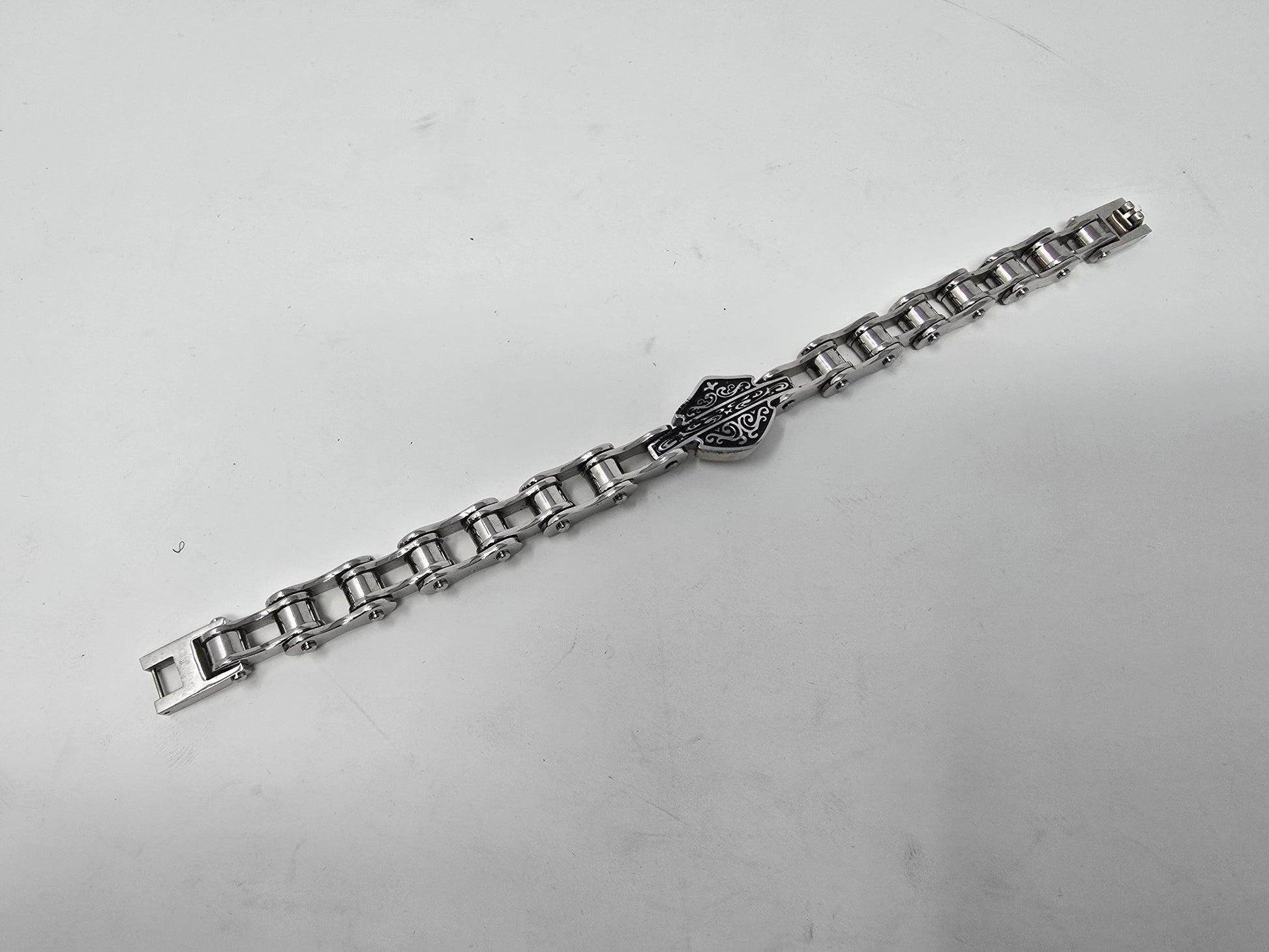 Discount Biker Supply Women's Bar & Shield - Bike Chain Bracelet. This meticulously handcrafted piece is designed to elevate your style, adding a touch of opulence to your look. The bracelet Comes packaged in a sophisticated Discount Biker Supply velvet bag.