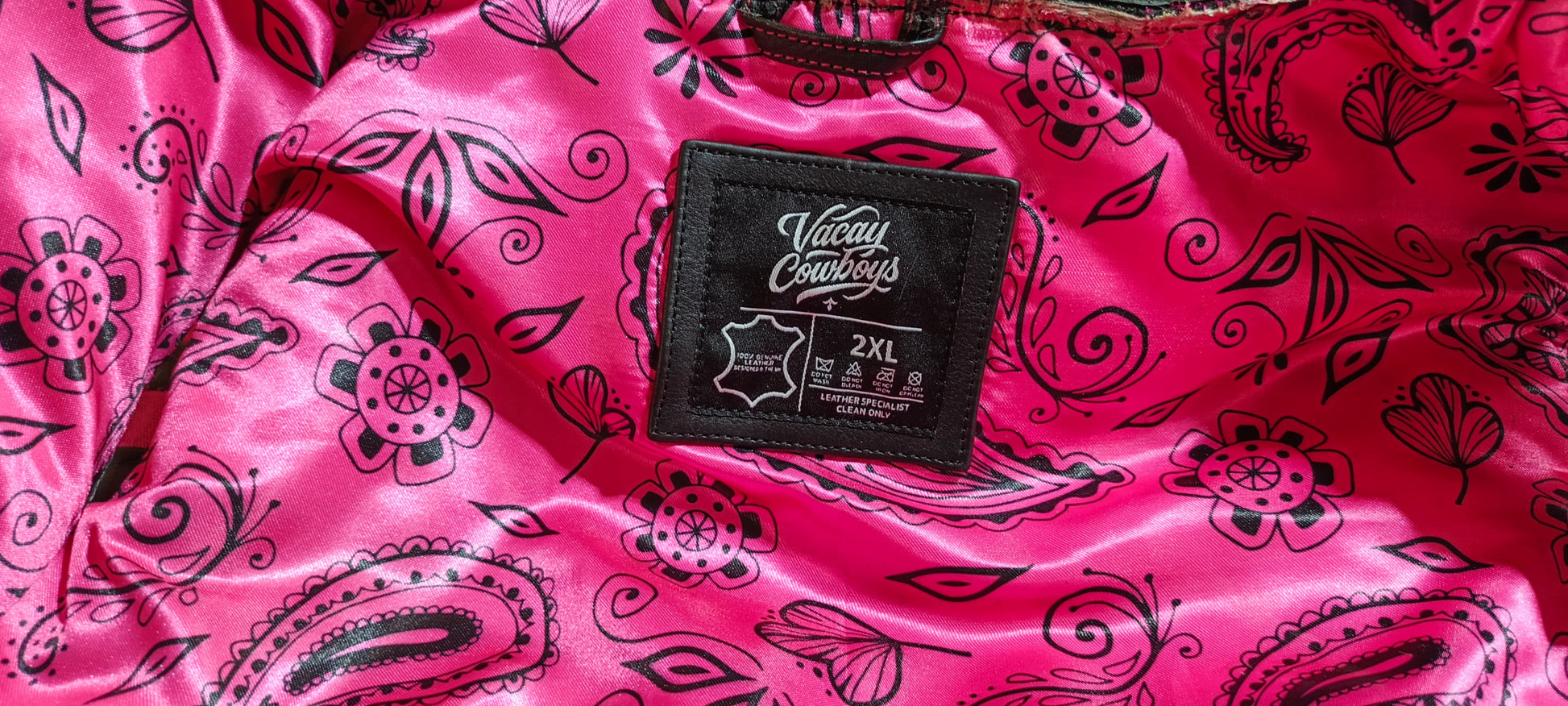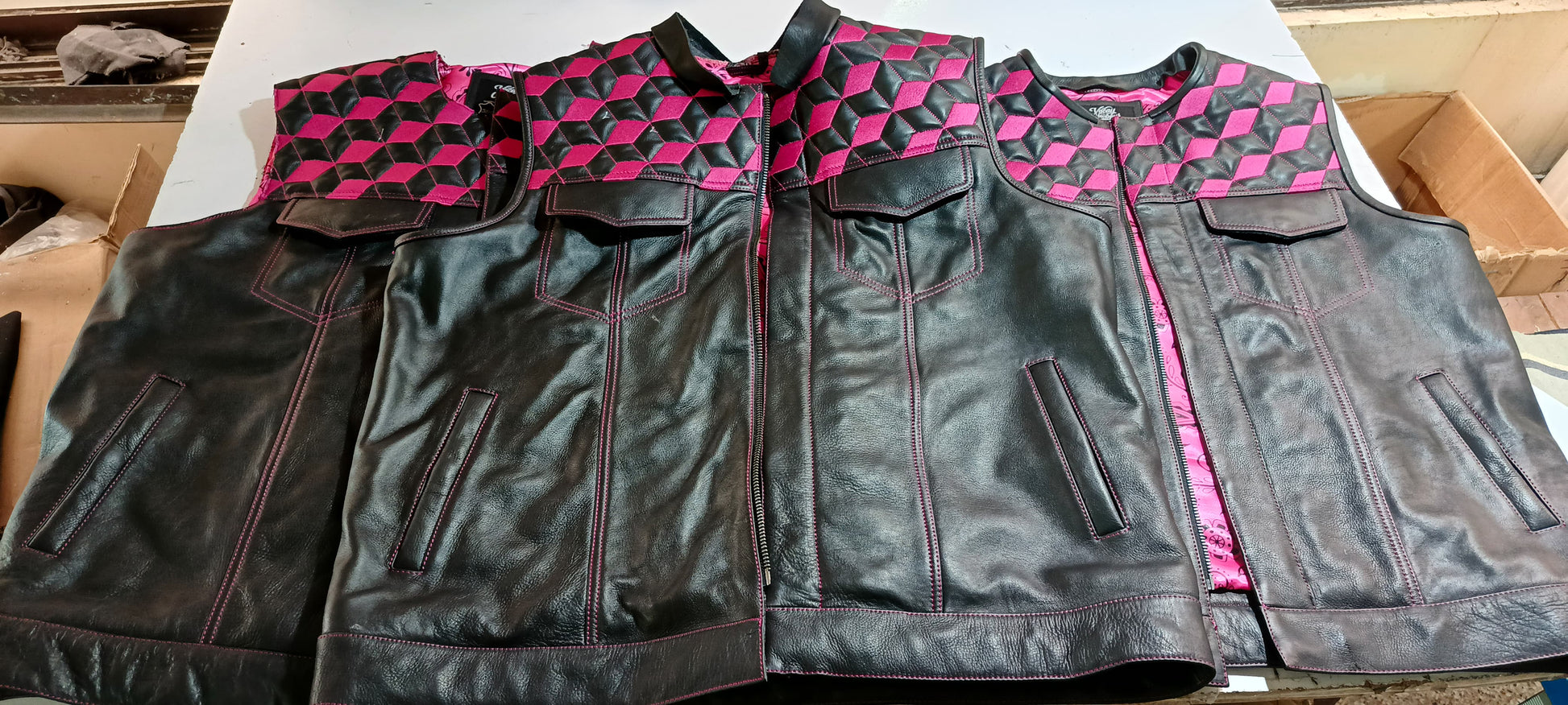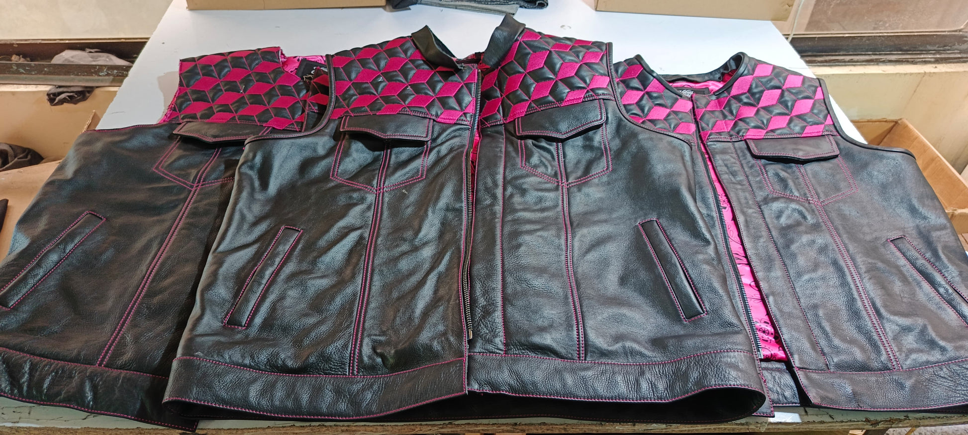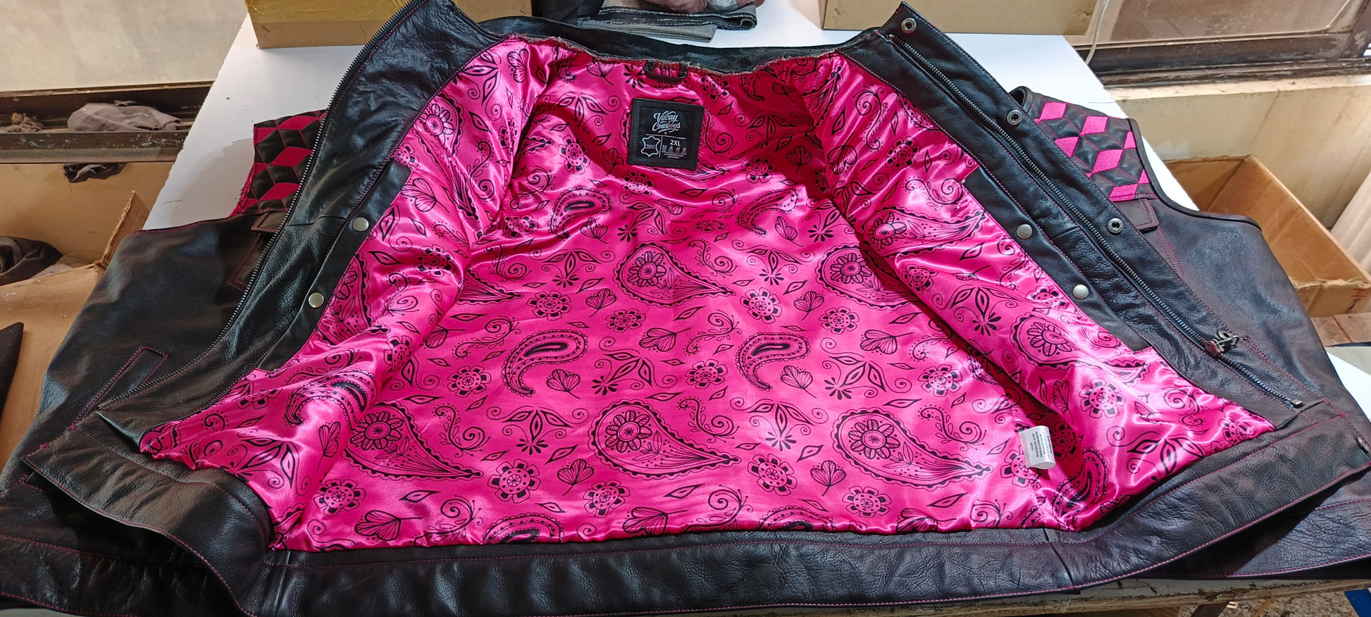 Natural Naked Cow Hide Leather, Front chest & Back Yoke - Embroidered Diamond/Cube Quilt pattern with signature pink Thread stitching.