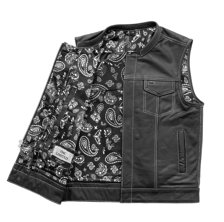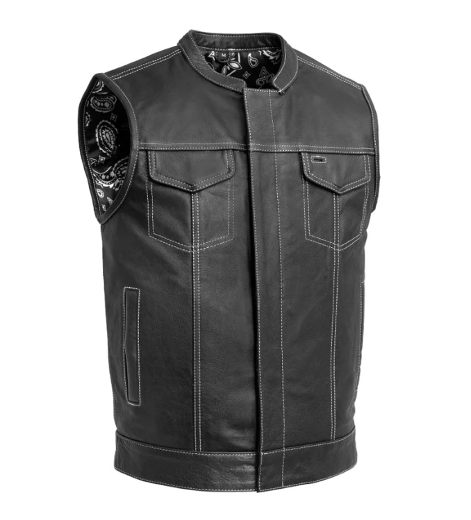 The Cut Men's Motorcycle Leather Vest Looking for a club style vest? The Cut is our more budget-priced version of a club vest. Crafted from soft, milled cowhide, this vest still has some of our best features. Four pockets up front, a single panel back and mesh lining with easy access panels for easy patching. And of course, two conceal carry pockets! Features: 0.9 - 1.0 mm soft Milled Cowhide Club style vest with banded collar, covered snaps and hidden cropped center zipper Two snap down chest pockets Two snap down slash pockets Two conceal carry pockets with tapered holsters Interior cellphone pocket Single panel back up to size 5XL Mesh lining with easy access panels for patches and embroideries YKK zipper