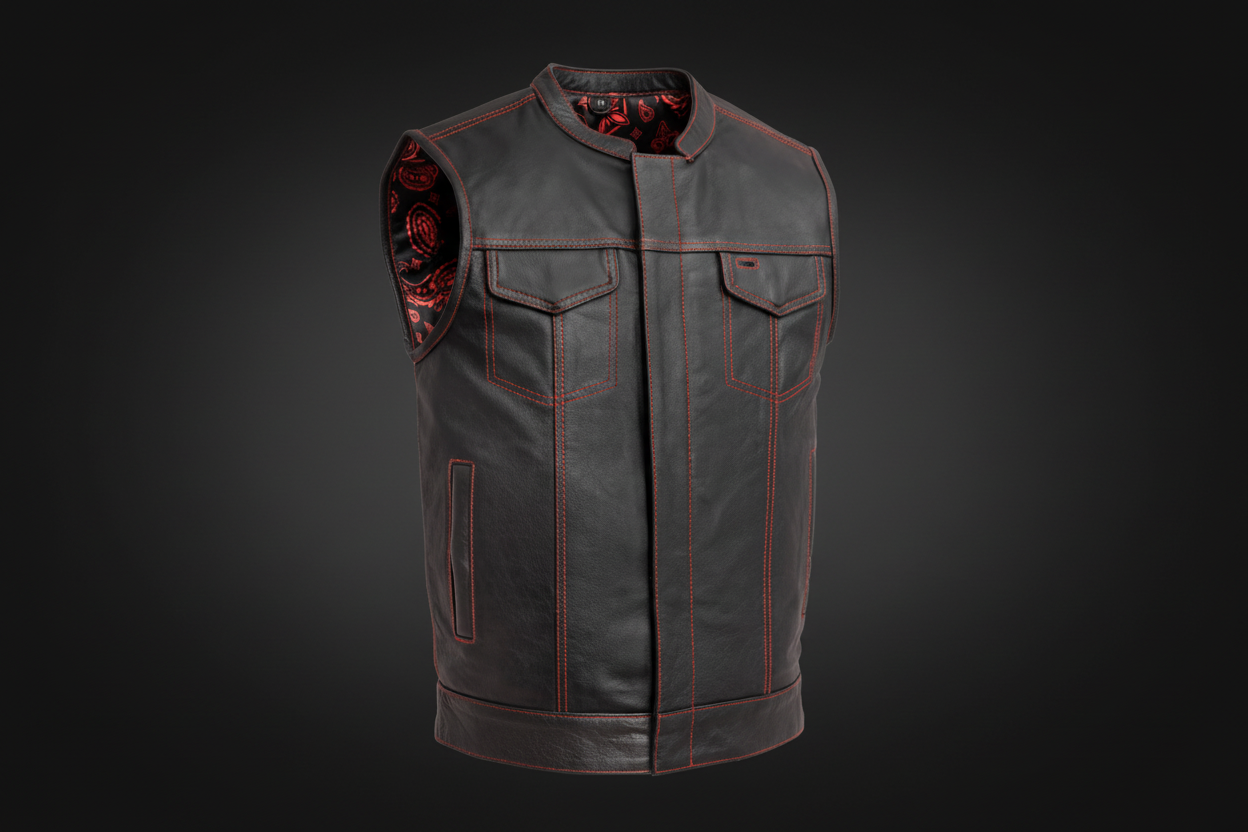 The Cut Men's Motorcycle Leather Vest Looking for a club style vest? The Cut is our more budget-priced version of a club vest. Crafted from soft, milled cowhide, this vest still has some of our best features. Four pockets up front, a single panel back and mesh lining with easy access panels for easy patching. And of course, two conceal carry pockets! Features: 0.9 - 1.0 mm soft Milled Cowhide Club style vest with banded collar, covered snaps and hidden cropped center zipper Two snap down chest pockets Two snap down slash pockets Two conceal carry pockets with tapered holsters Interior cellphone pocket Single panel back up to size 5XL Mesh lining with easy access panels for patches and embroideries YKK zipper