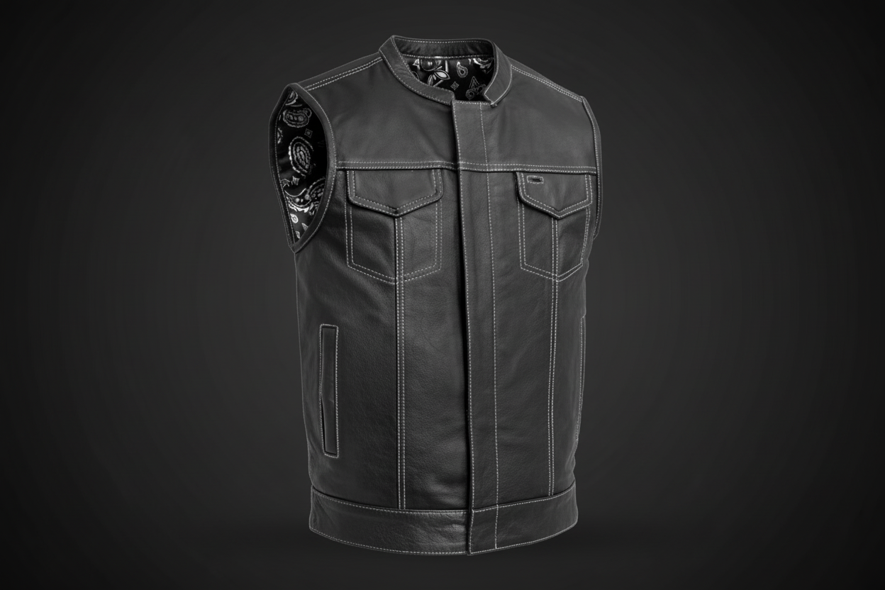 The Cut Men's Motorcycle Leather Vest Looking for a club style vest? The Cut is our more budget-priced version of a club vest. Crafted from soft, milled cowhide, this vest still has some of our best features. Four pockets up front, a single panel back and mesh lining with easy access panels for easy patching. And of course, two conceal carry pockets! Features: 0.9 - 1.0 mm soft Milled Cowhide Club style vest with banded collar, covered snaps and hidden cropped center zipper Two snap down chest pockets Two snap down slash pockets Two conceal carry pockets with tapered holsters Interior cellphone pocket Single panel back up to size 5XL Mesh lining with easy access panels for patches and embroideries YKK zipper